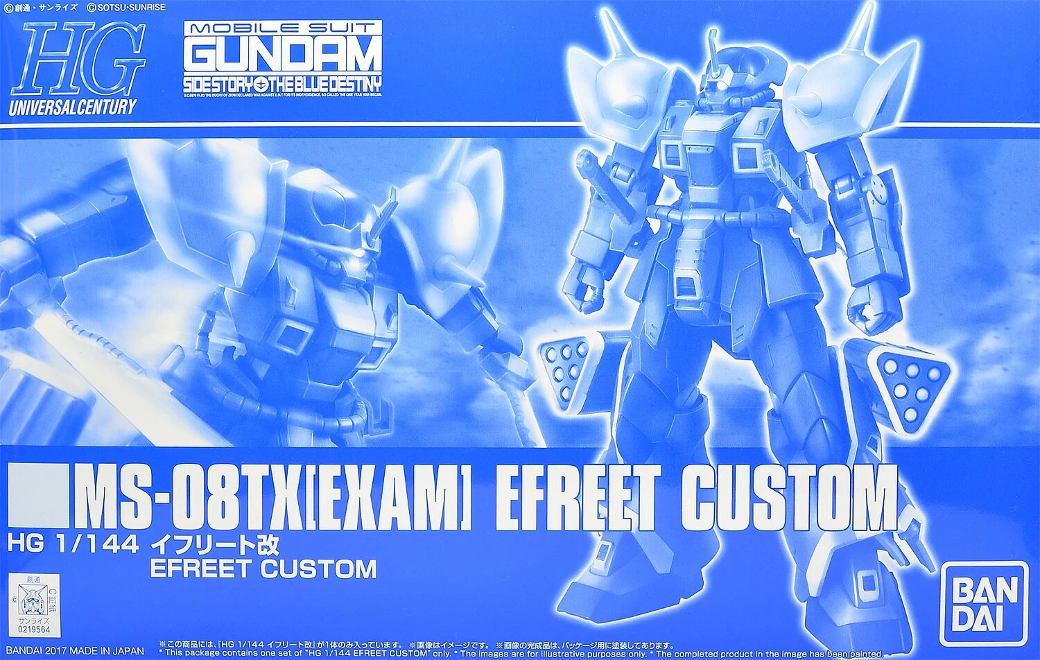 Le HGUC 1/144 [EXAM] Efreet Custom (MS-08TX) est un kit High Grade à l’échelle 1/144 sorti en 2017, en exclusivité sur la boutique en ligne Bandai Hobby. Il est issu du de jeu MOBILE SUIT GUNDAM Side Story : THE BLUE DESTINY.